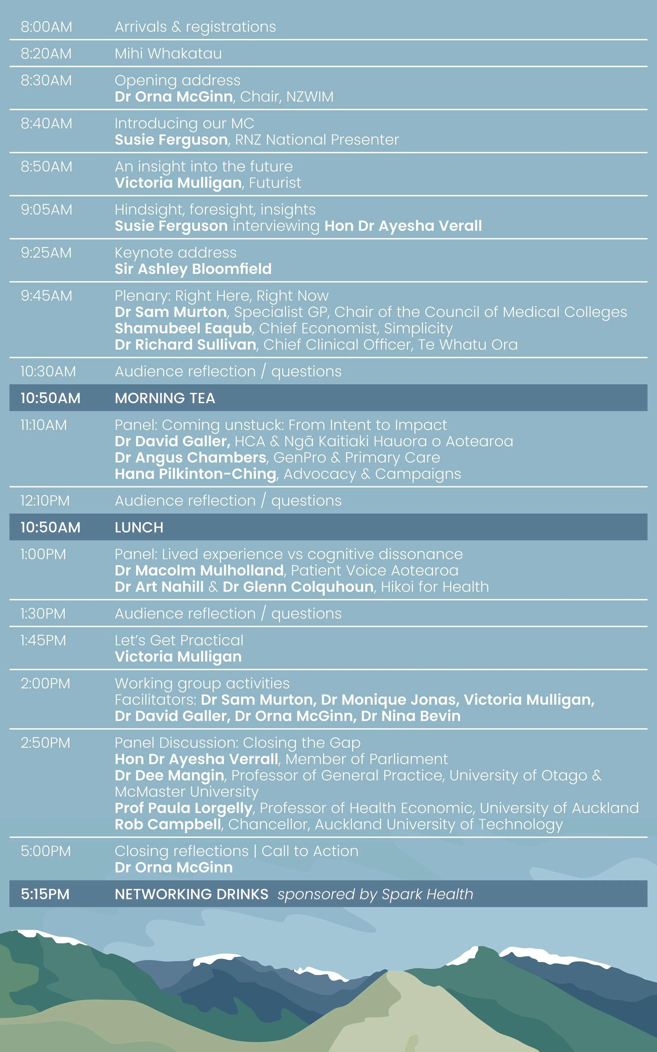 Our key speakers & special guests include Sir Ashley Bloomfield, Hon Dr. Ayesha Verrall, Dr Samantha Murton, Dr David Galler, Dr Rawiri Jansen, Shamubeel Eaqub, Rob Campbell, Dr Bryan Betty, Dr Angus Chambers, and many more. Susie Ferguson of RNZ National will feature as our MC for the day.
